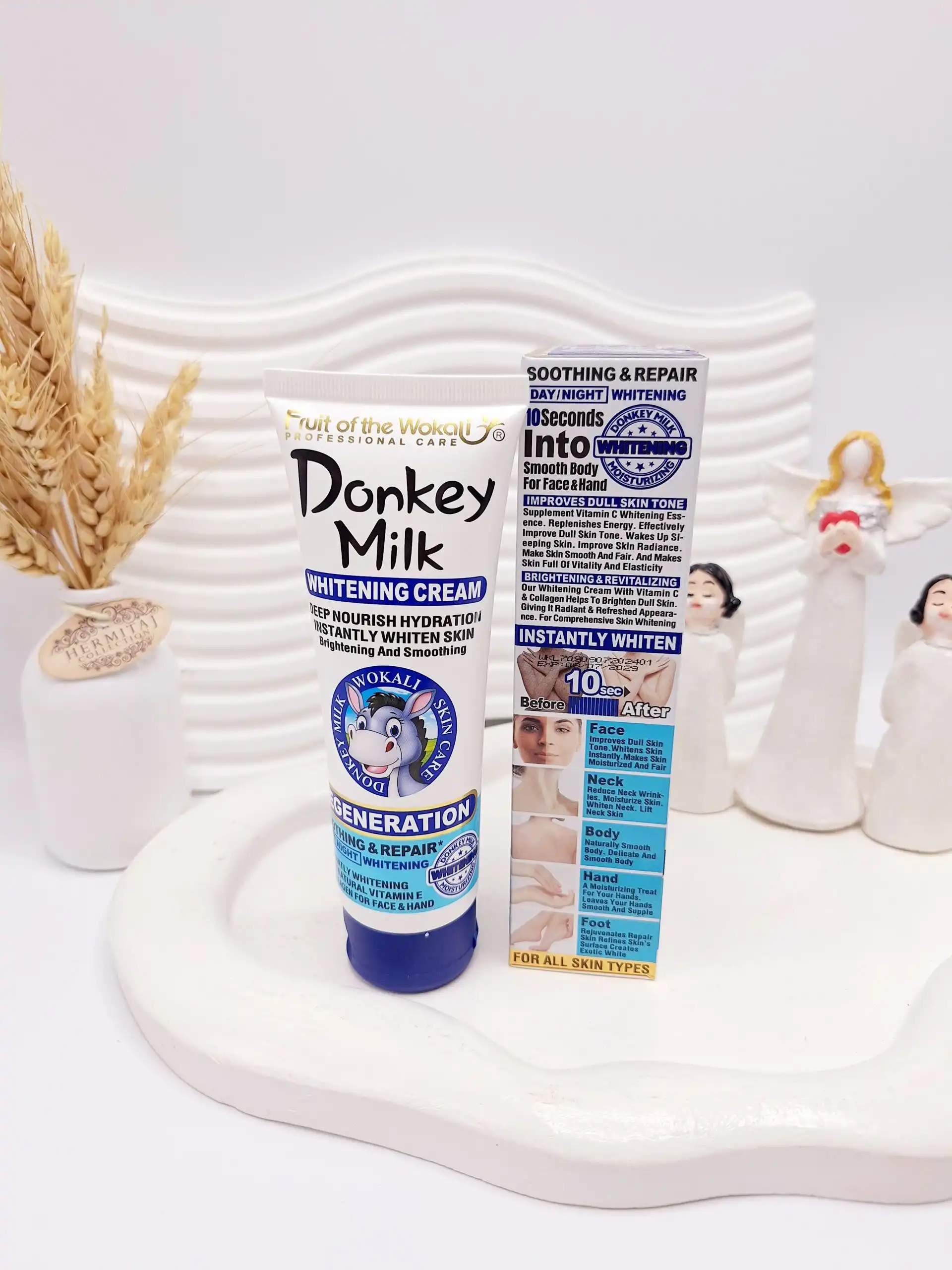 حاوی عصاره شیر الاغ یک بازسازی کننده طبیعی است که روند پیری پوست را کند میکند و به سفت شدن پوست کمک میکند.